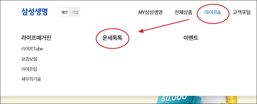 ▼삼성 라이프 닷컴 사이트에 접속하면 메뉴에서 [라이프]와 [운세톡톡]을 차례대로 클릭해 주세요.