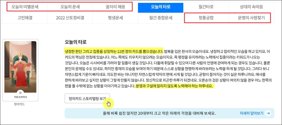 ▼오늘의 타로 결과가 나왔습니다. 냉정한 판단 그리고 집중을 상징하는 11번 정의 카드를 뽑았다고 합니다. 이에 따라 오늘 무슨 일을 겪게 되고, 어떻게 대처하는지 상세한 운세 풀이를 통해 알 수 있습니다. 더 나아가 어떻게 하면 좀 더 좋은 하루를 보낼 수 있는지 조언도 해주고요. 풀이 다음에는 타로카드에 대한 스토리텔링을 볼 수 있는 버튼이 있습니다. 한 번 클릭해 보겠습니다.