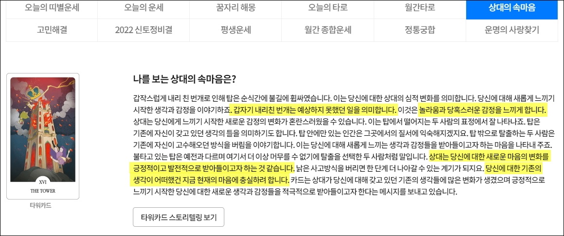 ▼해당 운세 서비스를 통해 지금 내가 생각하고 있는 일이 어떤 결과로 이어질지 확인할 수 있는데요. 어떤 카드를 선택하느냐에 따라 해석이 달라집니다.