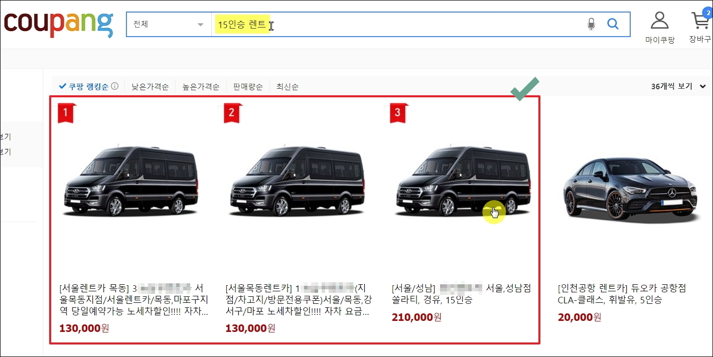 ▼두 번째로 15인승 승합차에 대한 렌트 상품을 알아보기 좋은 곳을 알려드리겠습니다. 바로 쿠팡 입니다. 쿠팡 사이트에 접속해서 사이트 검색창에 "15인승 렌트"를 입력해 보세요. 그럼 여러 상품이 나타납니다. 이 중에서 마음에 드는 것을 클릭해 주세요.