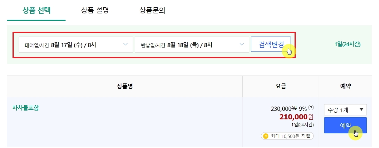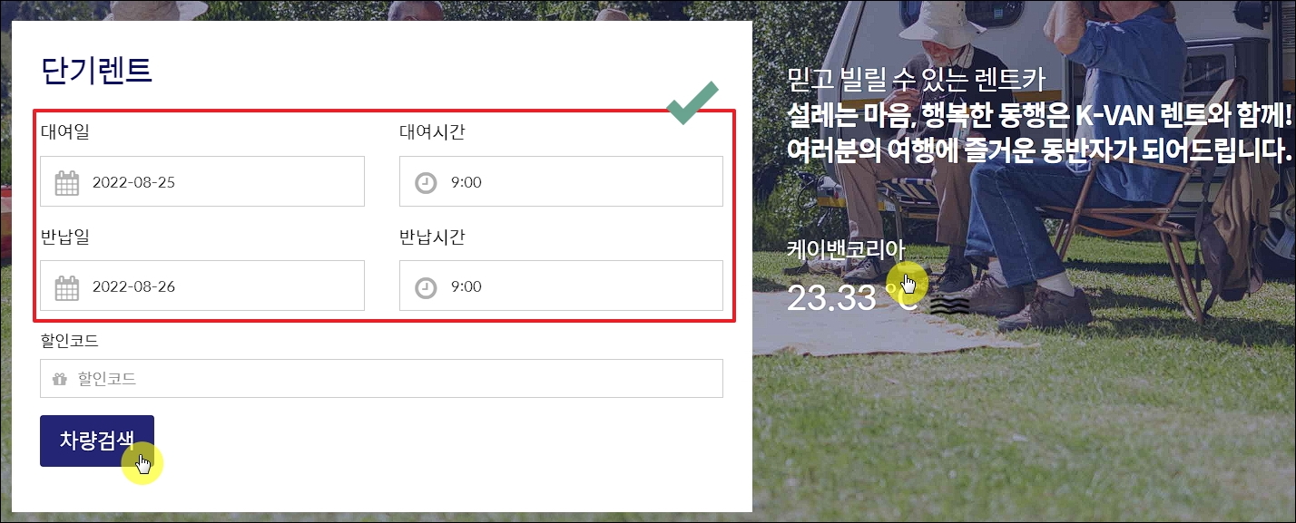 ▼사이트에 접속하면 렌트에 관련된 몇 가지 정보를 입력해야 합니다. 대여일, 반납일, 대여시간, 반납시간을 입력한 후 [차량 검색] 버튼을 눌러주세요.
