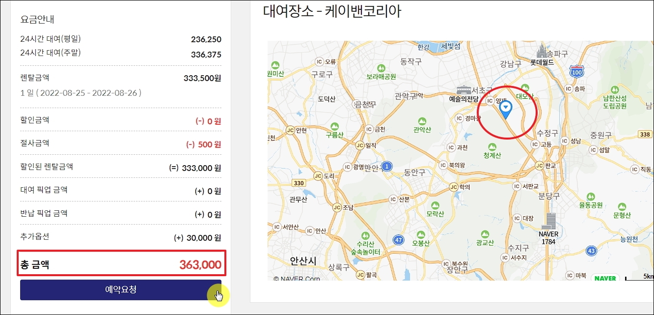 ▼여러 가지 선택을 한 후 사이트 화면에서 좌측 하단을 보면 총 금액이 나타납니다. 가격표를 통해 선택한 것이 제대로 반영되었는지 확인해 주세요. 모두 맞으면 [예약 요청] 버튼을 눌러 승합차 렌트를 이용할 수 있습니다.