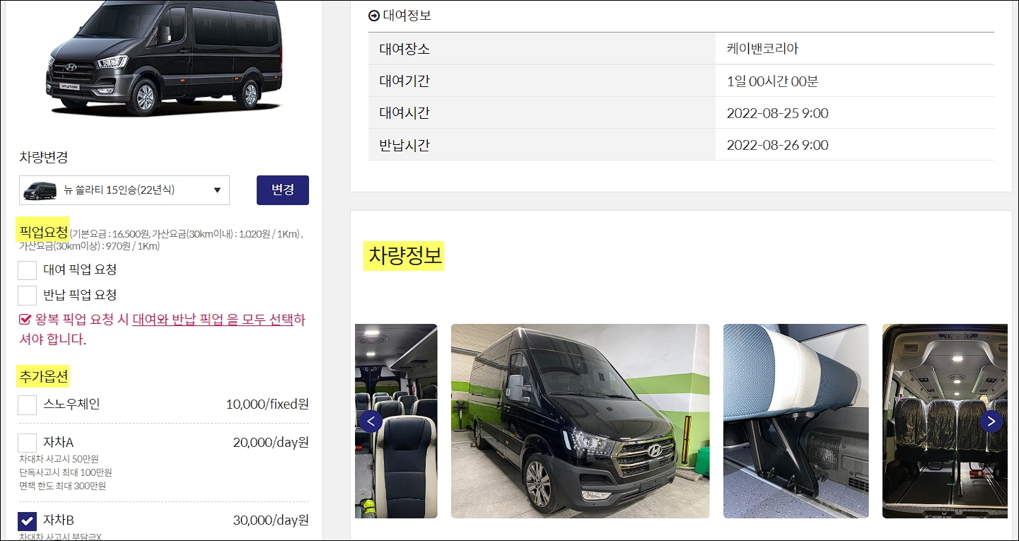 ▼마음에 드는 15인승 승합차를 선택하면 예약 진행을 할 수 있는 페이지가 열립니다. 여기에서는 차량 정보를 살펴보거나 픽업요청 및 추가 옵션에 관하여 선택이 가능한데요. 대여장소에 방문이 어려운 분들은 픽업 서비스를 체크하면 됩니다. 기본요금과 가산요금이 추가로 붙는다는 점을 유의해 주세요.