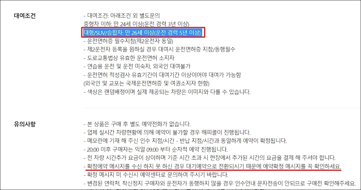 특히 승합차는 조건이 중형차 이하보다 까다롭습니다. 업체마다 이러한 조건이 상이하기 때문에 안내사항을 꼼꼼히 읽어보셔야 해요.