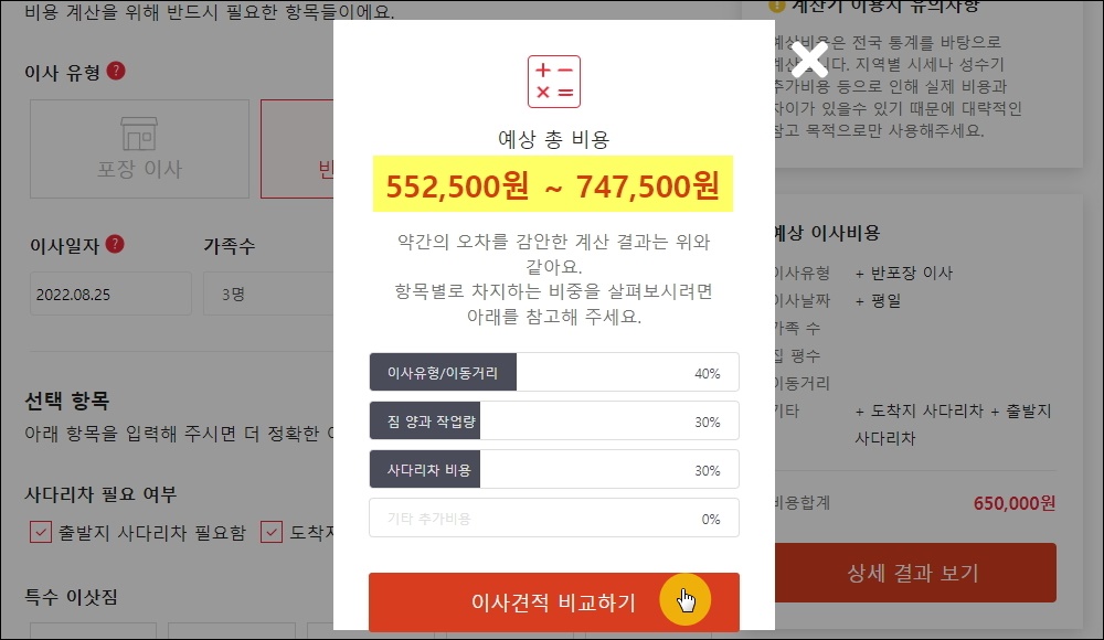 ▼필수 및 선택 항목 조건에서 본인의 상황에 맞게 선택을 한 후 [상세 결과 보기] 버튼을 눌러 보세요. 그럼 대략적인 비용을 알려줍니다. 제 경우에는 반포장을 선택한 부분이 최종 금액에 많은 영향을 미쳤었네요. 그 다음으로 많은 비중을 차지하는 것은 사다리차 비용입니다. 이런 식으로 어떤 부분에서 나의 이사 비용에 큰 영향을 미치는지 알 수 있어요. 다 확인했으면 [이사견적 비교하기] 버튼을 클릭해 보세요.