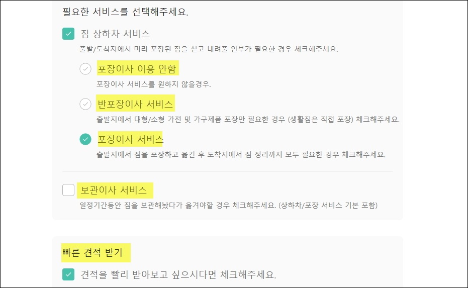 ▼받고 싶은 견적의 수는 1개가 아닌 2개로 하는 것이 좋고요. 짐 상하차 서비스 종류에서는 [반포장 이사 서비스]를 선택해 주세요.