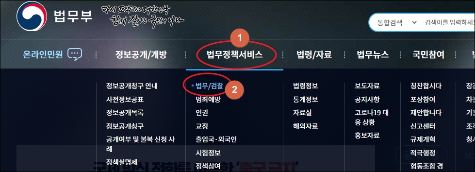 ▼법무부 홈페이지에 접속했습니다. 여기에서 메뉴에 있는 [법무 정책 서비스]를 클릭해 보세요. 그럼 여러 가지 하위 메뉴가 나타나는데요. 여기에서 [법무 / 감찰]을 선택합니다.