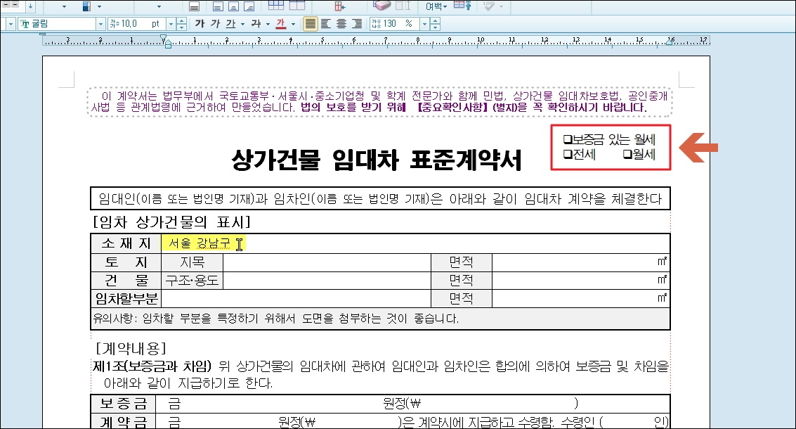 ▼저는 아래아 한글 프로그램을 통해 사무실 임대차 표준 계약서 양식을 열어보았습니다. 빈 칸에 소재지 관련 정보를 입력해 보았는데요. 직접 해보니 편하게 컴퓨터로 내용을 입력할 수 있네요. 보증금 있는 월세, 그냥 월세, 전세 이렇게 사무실을 얻는 3가지 상황에서 해당 계약서 양식을 사용할 수 있습니다. 문서에 나타난 여러 항목에 맞는 내용을 빈 칸에 입력하기만 하면 되기 때문에 정말 편하게 임대차 계약서를 작성할 수 있습니다.