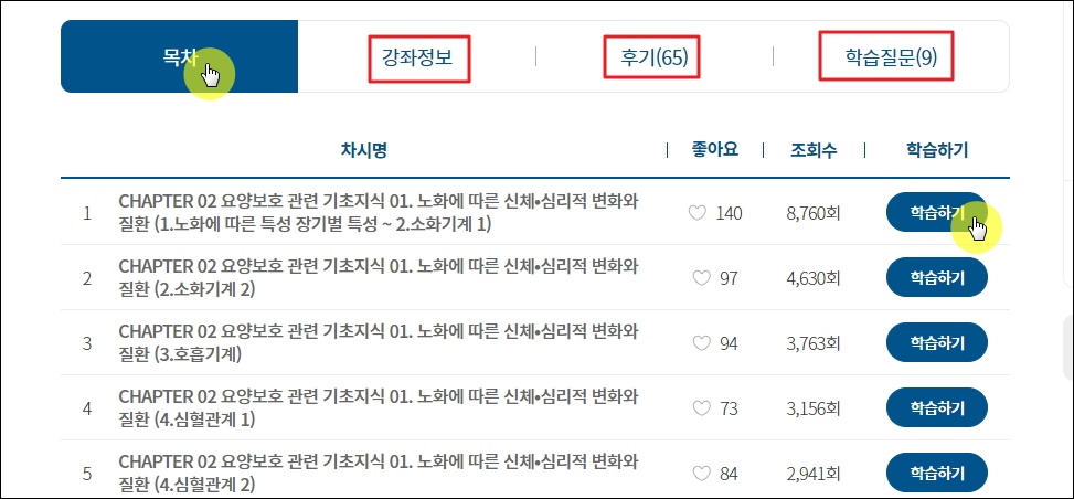 ▼하나의 강의에는 여러 차시가 포함되어 있습니다. 목차에서 배우고 싶은 부분을 찾아 [학습하기] 버튼을 클릭해주세요. 그럼 해당 부분에 대한 요양보호사 동영상 강의를 들을 수 있습니다. 로그인을 하지 않아도 강의 듣는 것이 가능합니다.