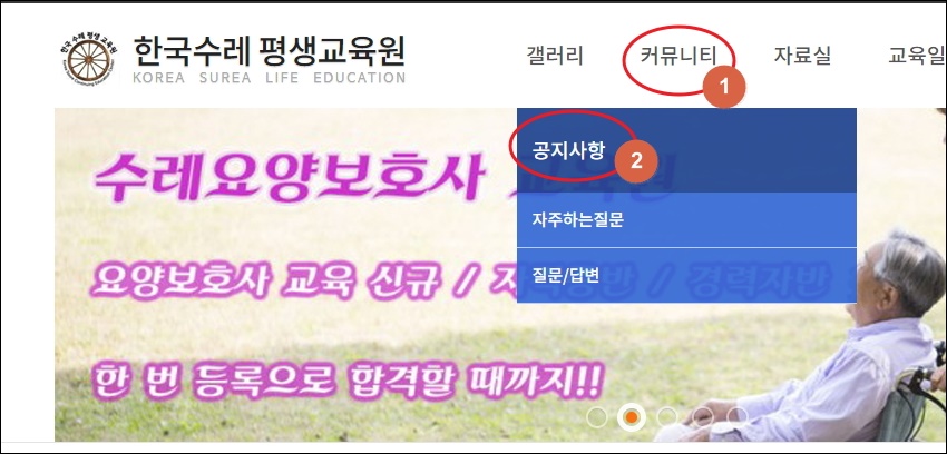▼사이트에 접속했는데요. 이곳에서는 요양보호사, 일반 경비 신임교육, 경비지도사에 대한 교육을 진행하는 곳입니다. 요점정리 자료에 접근하려면 메뉴에서 [커뮤니티]를 선택하면 나타나는 하위 메뉴에서 [공지사항]을 선택해 주세요.