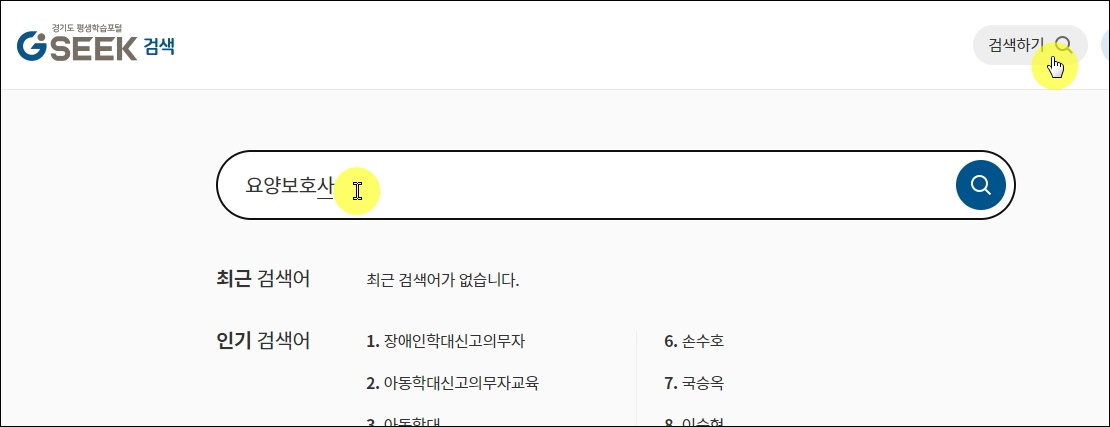 ▼경기도 지식 사이트에 접속하면 우측 상단에 있는 [검색하기] 버튼을 클릭해 주세요. 그럼 검색창이 나타나는데요. 여기에서 "요양보호사"를 입력한 후 [돋보기] 모양의 버튼을 클릭합니다.