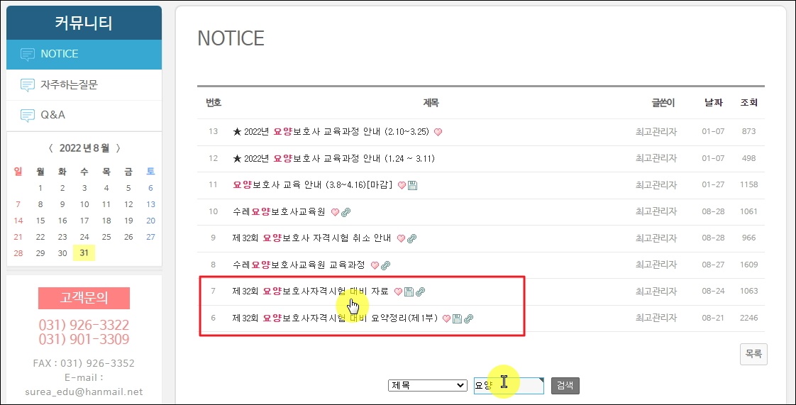 ▼NOTICE 페이지가 열리면 게시판이 하나 나타나는데요. 하단에 있는 검색창에 "요양보호사" 또는 "요양"을 입력한 후 [검색] 버튼을 클릭해 주세요. 그럼 요양보호사 자격시험 대비 요양정리 자료가 나타납니다. 앞서 보여드린 것은 1부 자료이고요. 2번 자료는 7번 게시물을 선택하면 이용이 가능합니다.