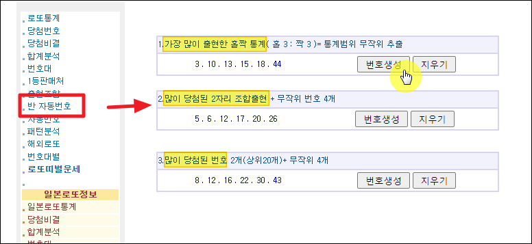 ▼우리가 앞서 살펴본 통계자료를 손쉽게 활용할 수 있습니다. [반 자동번호] 메뉴를 클릭해 보세요. 그럼 가장 많이 나온 숫자, 홀짝, 2자리 조합을 활용하여 예상번호를 생성 해주는 프로그램이 나타납니다. [생성] 버튼을 클릭하면 계속 새로운 예상번호를 받아볼 수 있어요.