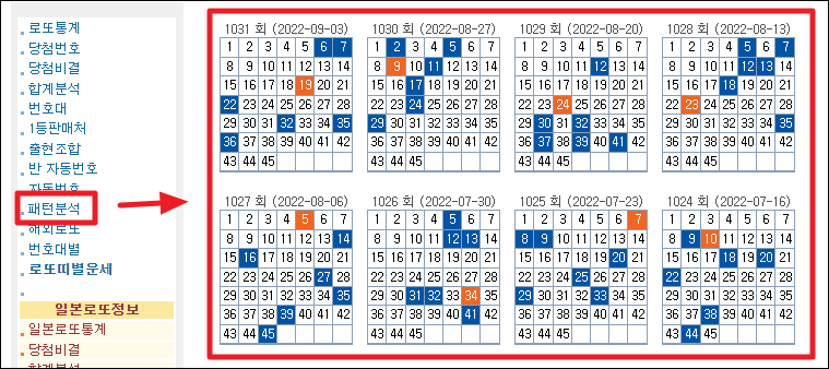 ▼패턴분석 자료를 통해 매주마다 당첨이 된 숫자의 위치를 눈으로 살펴볼 수 있는데요. 통계와는 관련이 적지만, 당첨된 로또번호가 어느 위치에 많이 분포가 되어 있는지 파악하고 싶을 때 유용합니다.