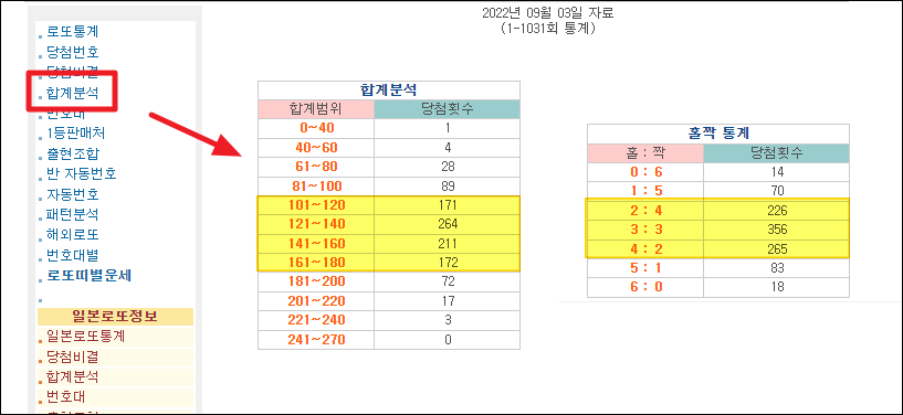 ▼앞서 가장 많이 나온 숫자는 메뉴에서 [로또통계]를 선택하면 확인할 수 있습니다. 매주마다 계속 업데이트가 되기 때문에 최신 자료를 확인하고 싶다면 클릭해 보세요. 그 아래에 있는 [합계분석]을 클릭하면 해당 통계자료가 나타나는데요. 당첨이 된 로또번호를 모두 합한 값이 121에서 140 사이가 될 때 264회로 가장 많이 나온 것을 알 수 있습니다. 홀수와 짝수가 각각 3개씩 있는 경우가 345회로 가장 많고요.