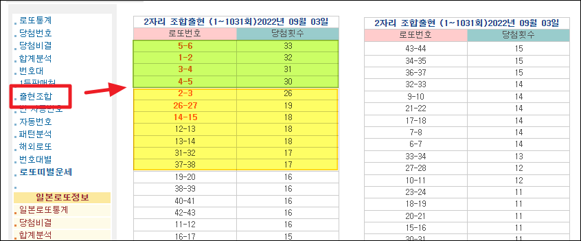 ▼이번에는 출현 조합을 살펴보겠습니다. 연속된 숫자인 5번과 6번, 1번과 2번, 3번과 4번, 4번과 5번인 경우 로또 당첨이 될 확률이 높았습니다. 물론 나온 횟수가 많지 않기 때문에 자주 사용하기에 좋은 숫자는 아니에요. 그저 참고 정도만 하는 것이 좋을 것 같습니다.