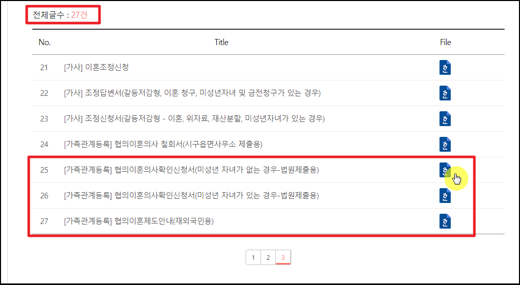 ▼ 이혼에 관련된 서류 양식이 27건이나 나타났습니다. 여기에서 [가족관계등록] 카테고리를 찾아보면 협의이혼에 관련된 신청서, 철회서, 안내서를 찾을 수 있습니다. 여기에서 신청서 옆에 있는 아래아 한글 문서 모양의 버튼을 클릭하면 해당 양식 파일을 내려 받을 수 있습니다.