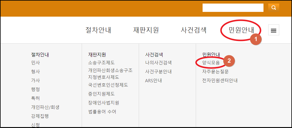 ▼ 인터넷 법원 사이트에 있는 [전자민원센터] 페이지에 접속했습니다. 여기에서 메뉴에 있는 [민원안내]를 클릭해 보세요. 그럼 여러 가지 서류 양식을 다운 받을 수 있는 페이지로 이동하는 [양식모음] 버튼을 찾을 수 있습니다.