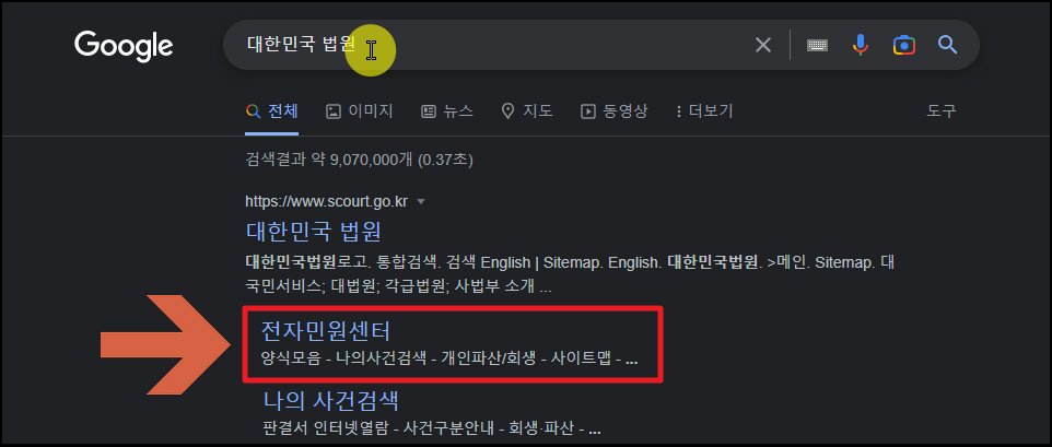 ▼ 제가 첨부한 양식을 포함하여 현재 사용되고 있는 다양한 협의이혼 관련 서류를 다운 받는 방법을 알려드리겠습니다. 자녀가 있는 경우와 아닌 경우에 따라 신청서 양식이 달라질 수 있습니다. 제가 첨부한 것은 자녀가 없는 경우인데, 자녀가 있는 경우라면 다음과 같이 대한민국 법원 사이트에 접속하셔서 협의이혼 관련 서류를 내려 받으면 됩니다. 대한민국 법원 검색 시 나오는 [전자민원센터]를 선택하여 해당 페이지로 바로 이동해 주세요.