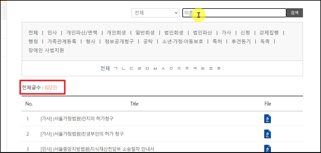 ▼ 양식모음 페이지가 열렸습니다. 이곳에서는 822건의 서류 양식을 만나볼 수 있는데요. 카테고리를 보면 알 수 있듯이 가족관계등록, 정보공개청구, 가사, 신청, 특허 등 다양한 상황에서 얻을 수 있는 양식 파일을 다운 받아볼 수 있습니다. 검색창에 [이혼]을 입력한 후 엔터키를 눌러주세요.