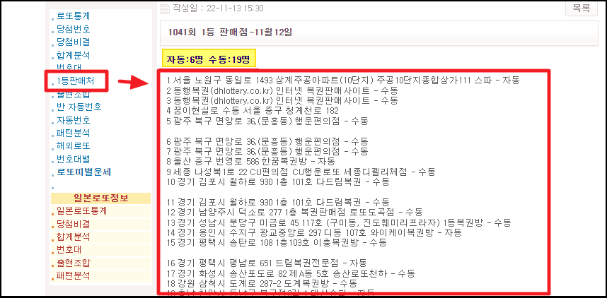 ▼ 좌측에 있는 메뉴에서 [당첨번호]를 클릭하면 앞서 확인한 역대 당첨번호 리스트 확인이 가능해요. 메뉴에서 중간에 위치한 [1등 판매처]를 선택하면 로또 1등을 배출한 지점에 대한 상호명과 주소 그리고 자동 및 수동 여부 확인도 가능합니다.