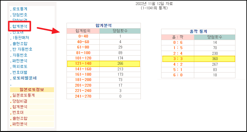 ▼ 합계분석 메뉴를 클릭하면 모든 숫자를 합한 결과를 바탕으로 만들어진 통계자료를 확인할 수 있습니다. 121에서 140 사이가 266회로 가장 많네요. 그 다음 홀수와 짝수가 각각 3개씩 있는 조합이 가장 많이 당첨이 되었고요.