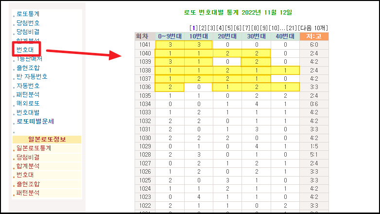 ▼ 다음은 최근 로또 1041회를 포함한 당첨번호 리스트 입니다. 각 숫자의 합계, 홀짝수 조합, 연속 번호도 볼 수 있어서 한 눈에 파악하기 좋은데요. 1회에서 최근까지 볼 수 있는 사이트가 있습니다. 이를 활용하는 방법도 알려드릴게요.
