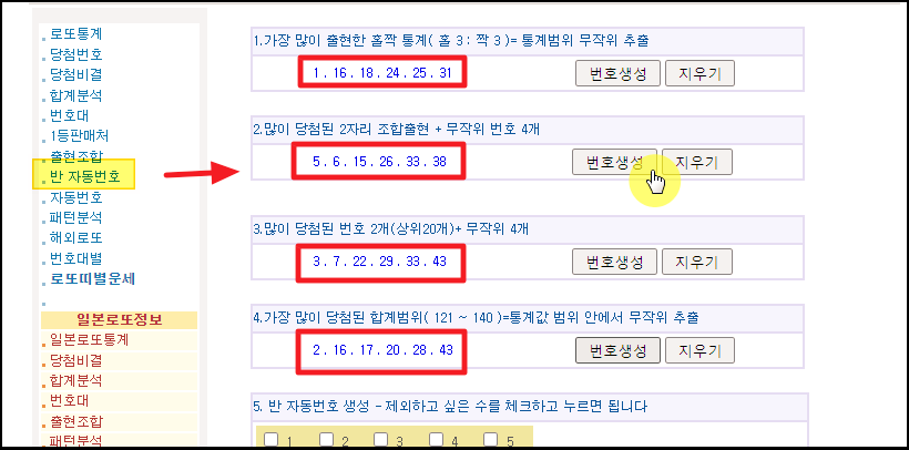 ▼ 메뉴에서 [반 자동번호]를 선택해 보세요. 그럼 가장 많이 출현한 홀짝 통계, 2자리 조합 출현, 합계범위 등의 통계자료를 바탕으로 만들어진 번호 생성기를 이용할 수 있습니다. [생성] 버튼만 누르면 계속 새로운 번호를 추천 받을 수 있어요.