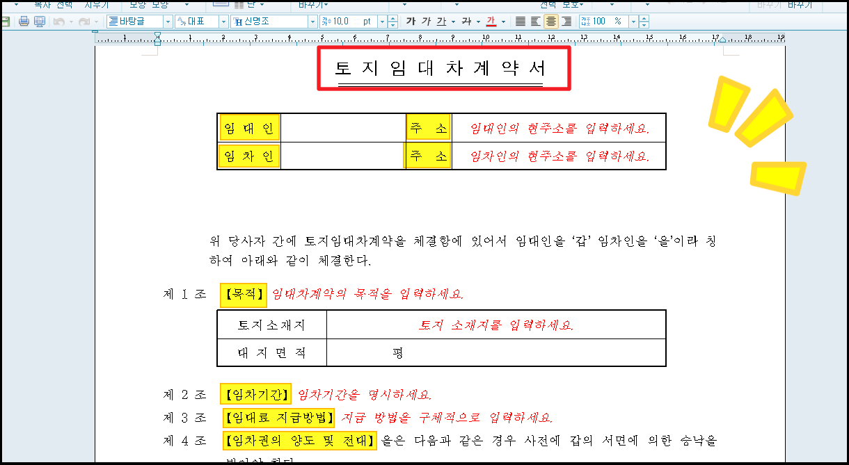 작성하기 좋은 토지 임대차 계약서 무료양식 다운 받기.