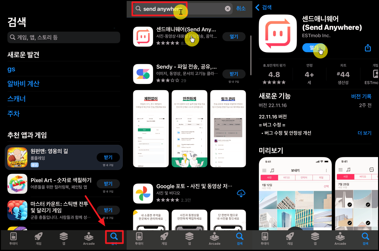 그럼 아이폰의 앱스토어에서 "샌드 애니웨어"라는 앱을 설치한 후 사진 옮기기 방법을 순서대로 따라해 보세요.