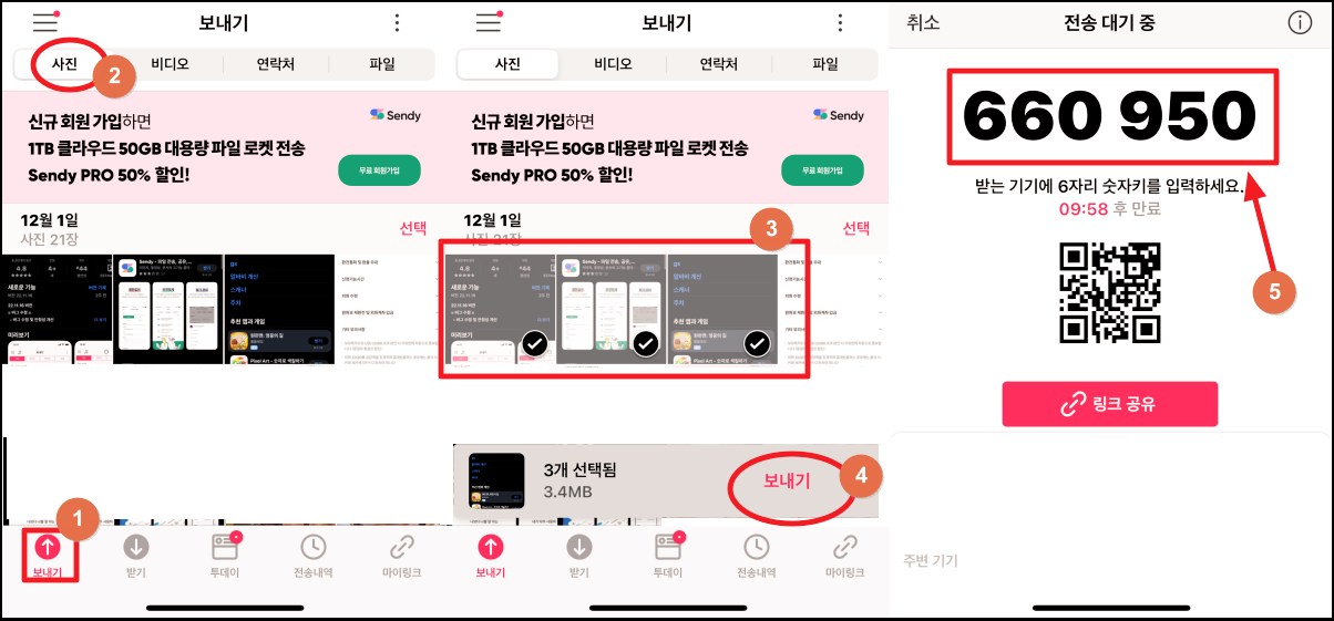 이번 시간에는 사진 옮기기 과정에 대해 자세히 알려 드릴게요. 일단 아이폰에서 옮기고 싶은 사진을 선택해 주세요. 한 개 이상의 파일을 선택하면 화면 하단 부분에 [보내기] 버튼이 추가로 나타나는데요. 해당 버튼을 눌러 보세요.