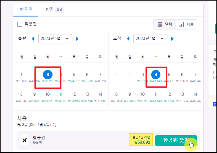 본인의 여행 일정을 전제로 하여 항공권 예약을 저렴하게 할 수 있는 날짜를 선택해 주세요. 저는 3일과 4일을 선택했고, 1인 기준으로 59,692원에 왕복 항공권을 구할 수 있다고 합니다.