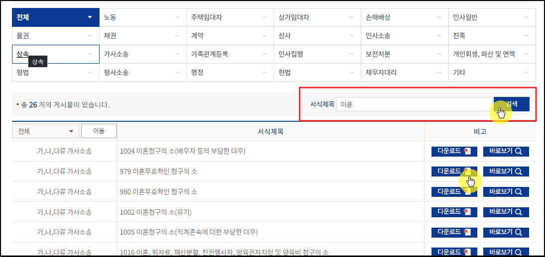 ▼ 자료실 페이지가 열리면서 계약, 행정, 상속, 형법, 손해배상 등 여러 가지 법률 관련 서식이 나타납니다. 여기에서 쉽게 이혼서류 양식을 찾기 위해서는 서식 제목을 "이혼"이라고 입력한 후 [검색] 버튼을 눌러주세요. 그럼 아래아 한글 파일로 다운 받을 수 있는 서식 리스트가 나타납니다. 여기에서 [다운로드] 버튼을 누르면 돼요. 로그인 없이 누구나 무료다운 받으실 수 있습니다.