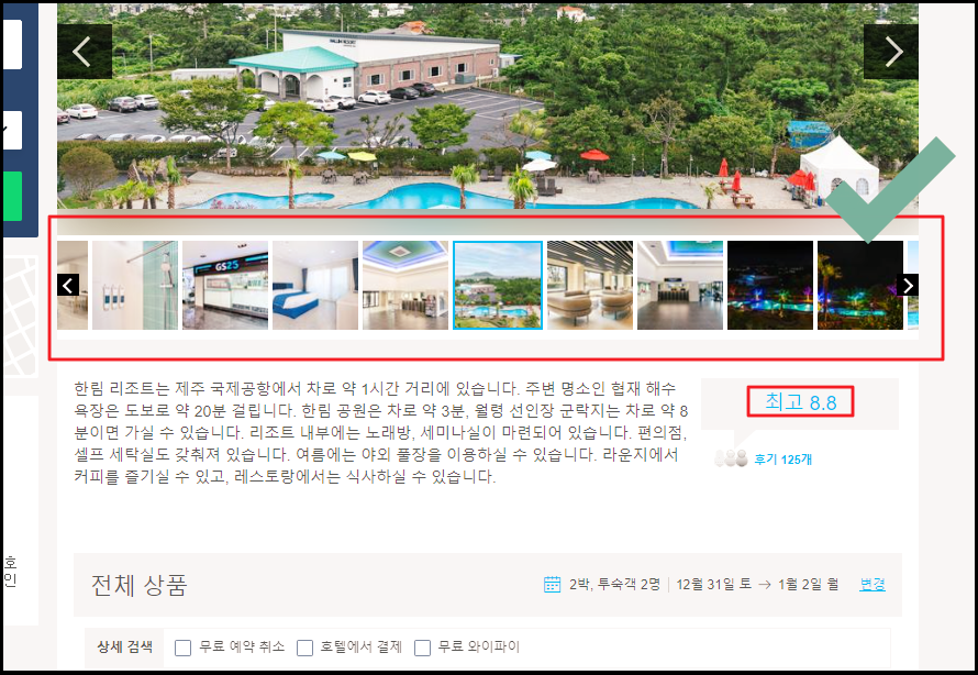 리조트 이름을 클릭하면 해당 숙소에 대한 많은 사진과 설명을 읽어볼 수 있습니다. 100개 이상의 후기도 읽어볼 수 있으니 순위와 함께 참고하면 좋습니다.