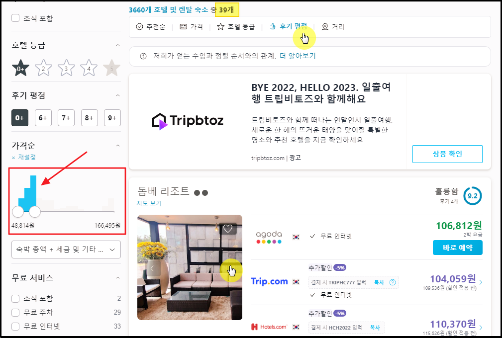 너무 가격이 비싼 숙소는 아무리 품질이 좋아도 이용하기 어려울 수 있습니다. 이럴 때에는 좌측에 있는 [가격순]에서 가격을 조절해 주세요. 막대그래프가 최대한 많이 포함되도록 지정하는 것이 좋습니다. 이렇게 지정한 결과 39개로 이루어진 리조트 순위를 확인할 수 있었는데요.