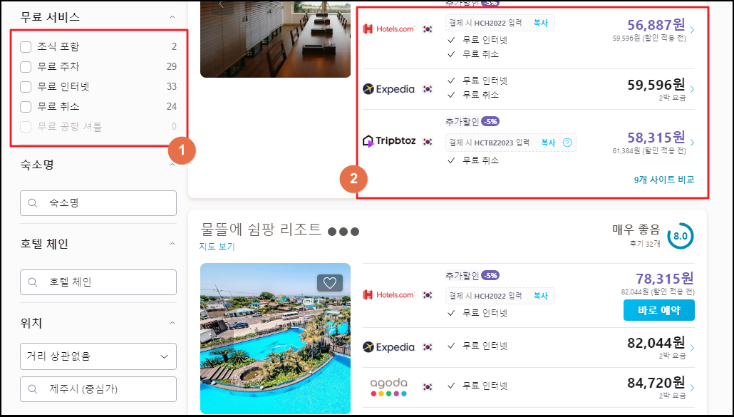 이곳의 경우 여러 가지 리조트나 호텔에 대한 예약을 진행할 수 있는 사이트의 정보를 모아서 한 번에 비교할 수 있도록 해놓은 곳인데요. 제주에 있는 모든 숙박업소의 순위를 파악할 때 유용합니다.