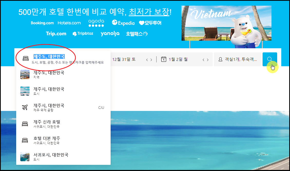호텔스컴바인 사이트에 접속했습니다. 지역을 제주로 입력해주시고요. 그 다음 숙소를 이용할 날짜와 객식이나 인원의 수를 입력합니다. 그 다음 검색 버튼을 클릭해 주세요.