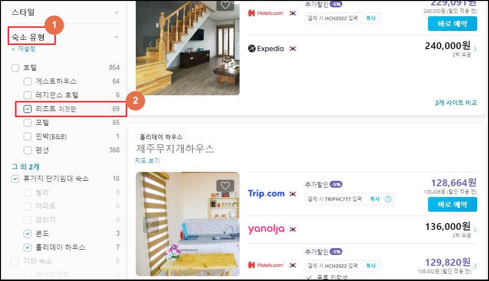 여기에서 제주 리조트 순위만 살펴보는 방법은 간단합니다. 좌측에 있는 카테고리에서 [스타일]에 있는 숙소 유형을 찾아주세요. 그럼 게스트하우스, 레지던스 호텔, 모텔 등 여러 유형을 선택할 수 있습니다. 여기서 리조트를 선택하면 됩니다.