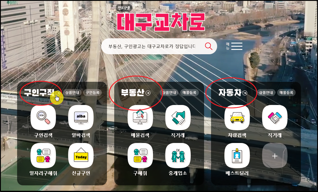 구인구직, 부동산, 자동차 관련 정보가 있는데요. 검색을 해도 되고, 카테고리에 있는 메뉴를 선택해도 됩니다.