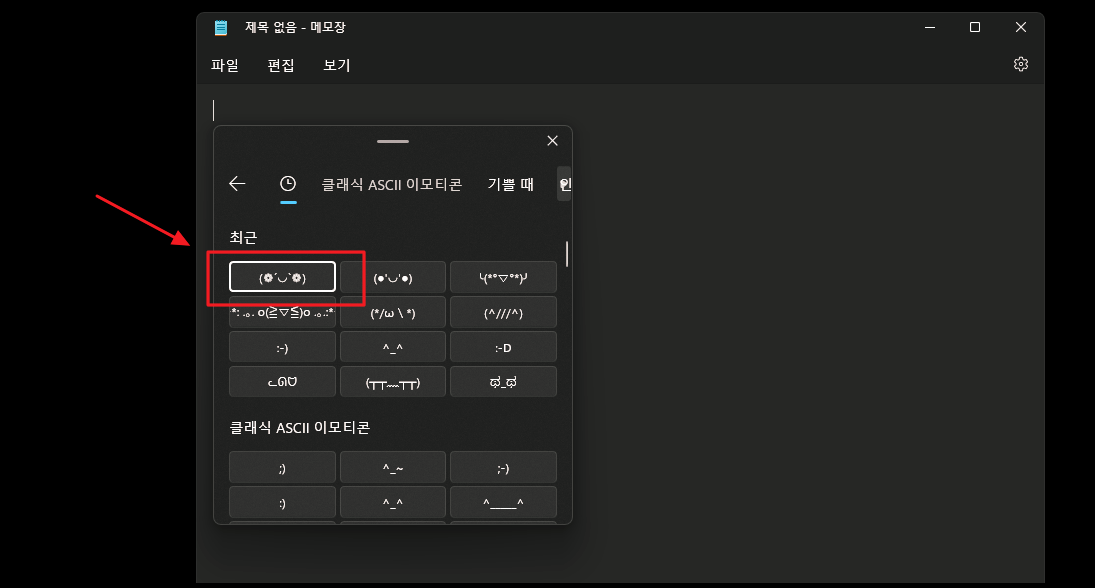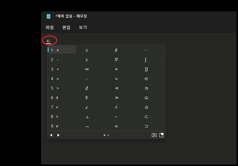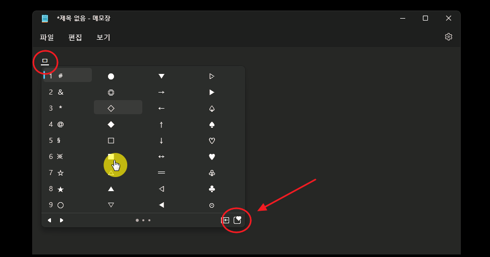 윈도우에서 메모장 프로그램을 열였습니다. 컴퓨터 자판에서 "ㅁ"키를 한 번 누른 후 "한자" 버튼을 눌러 보았습니다. 이에 따라 위와 같은 특수문자를 선택할 수 있는 메뉴가 나타나는데요. 각 기호를 사용할 수 있는 숫자키를 누르거나 방향키로 선택한 후 엔터키를 누르는 방식을 사용하면 됩니다. "미음"을 이용하면 하트, 세모, 동그라미, 별 등의 도형 문자를 입력할 수 있어요. 특수기호를 선택하는 창에서 가장 오른쪽 아래에 있는 메뉴를 클릭해 보세요. 그럼 이모지 사용이 가능해요.
