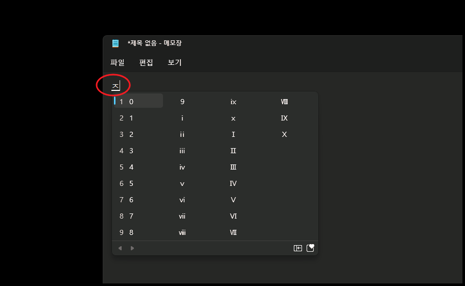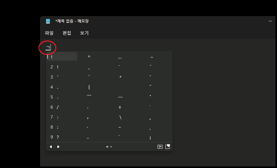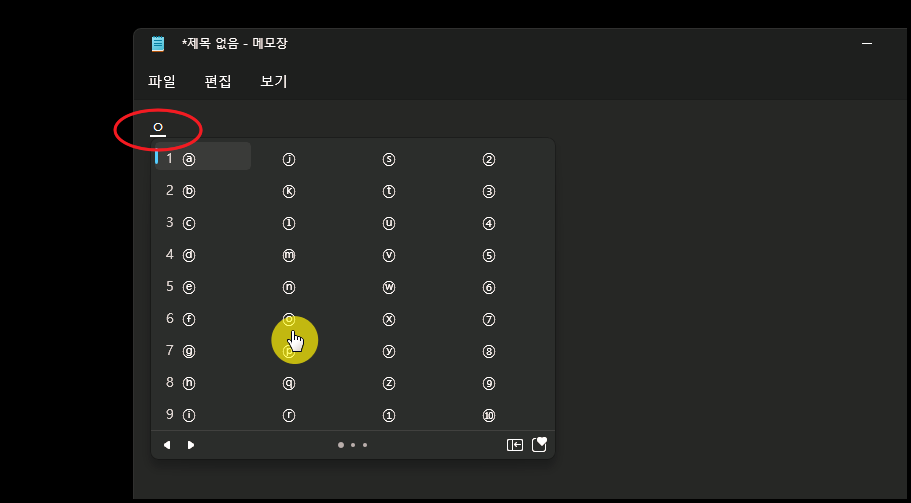 이번에는 컴퓨터 자판에서 이응과 한자키를 순서대로 눌러 나온 결과 입니다. 각 문자에 원을 둘러싼 모양의 특수기호를 사용할 수 있도록 되어 있는데요. 긴 글을 작성하다가 번호를 붙일 때 효과적입니다.