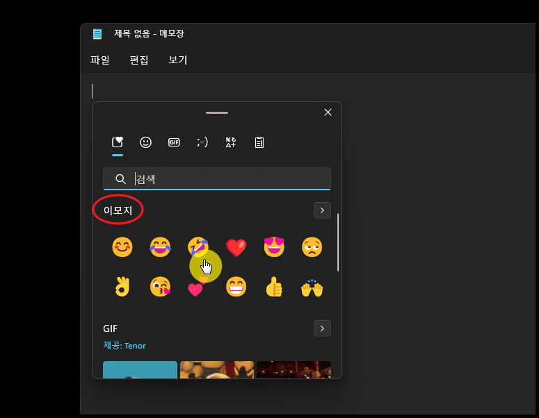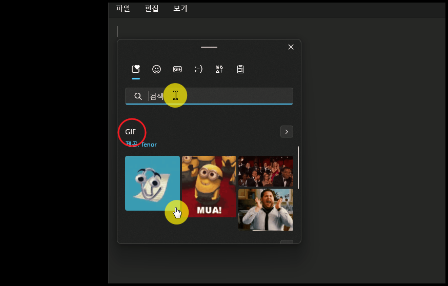 GIF 파일도 검색이 가능한데요. 이렇게 컴퓨터 자판에 없는 컨텐츠를 사용할 수 있게 되었다는 것을 알 수 있습니다. 저는 윈도우10을 사용하고 있는데요. 윈도우10에서만 되는 기능인지는 잘 모르겠네요.