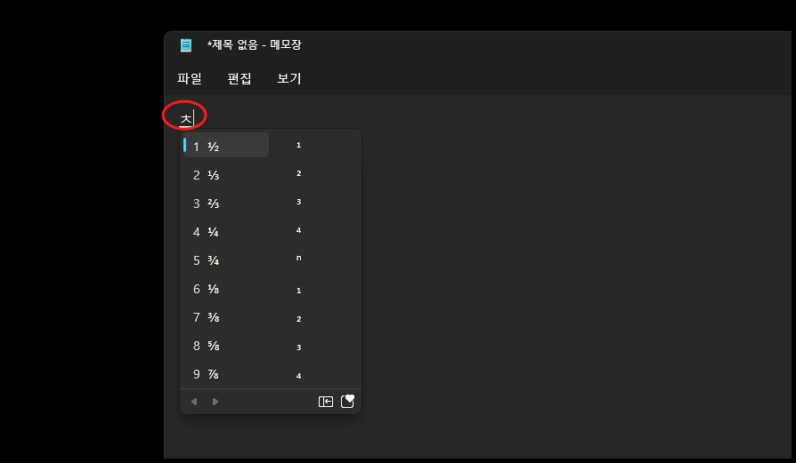 "치읏"을 이용해 보았습니다. 분수 입력할 때 사용하면 좋겠네요.