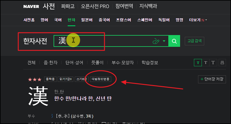▲ 컴퓨터나 스마트폰을 이용하여 네이버 한자 사전 사이트에 접속합니다. 그 다음 위와 같이 이름에 들어갈 한자를 검색해보면 대법원 인명용 여부를 확인할 수 있습니다.