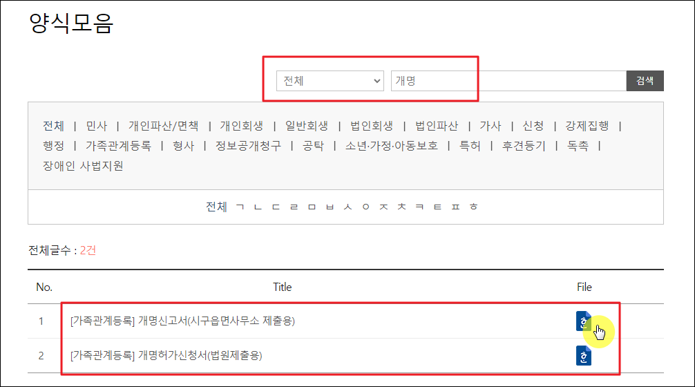▲ 양식모음 페이지가 열리면 '개명'을 검색해 보세요. 그럼 이름 변경에 관련된 양식을 찾을 수 있습니다. 개명신고서는 시구읍면사무소에 제출하는 것이고, 개명허가신청서는 법원에 제출하는 것입니다.