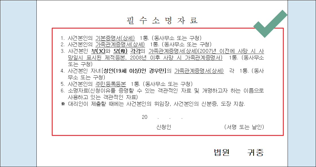 - 19세 이상의 자녀가 있는 경우에는 자녀의 가족관계증명서(상세) 1통