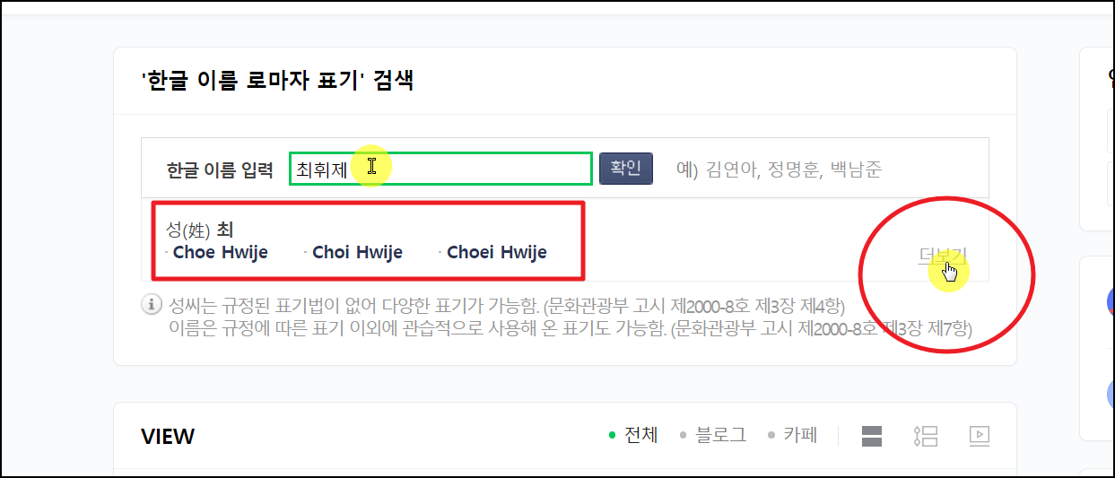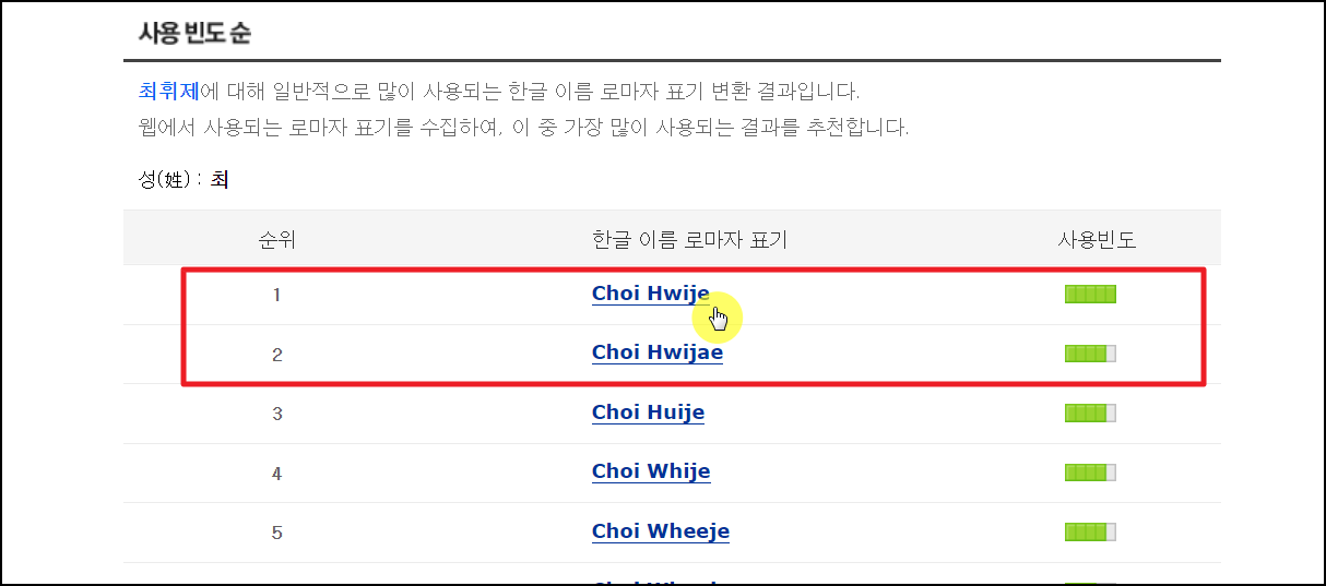 [더보기] 버튼을 눌러 새롭게 나타난 페이지를 보면 여러 가지 영문변환 결과가 나타나요. 여기에서 순위가 높을 수록 사람들이 많이 사용하는 표기임을 알 수 있는데요. 사용빈도에서 가장 높은 표기를 마우스로 클릭해 보세요.