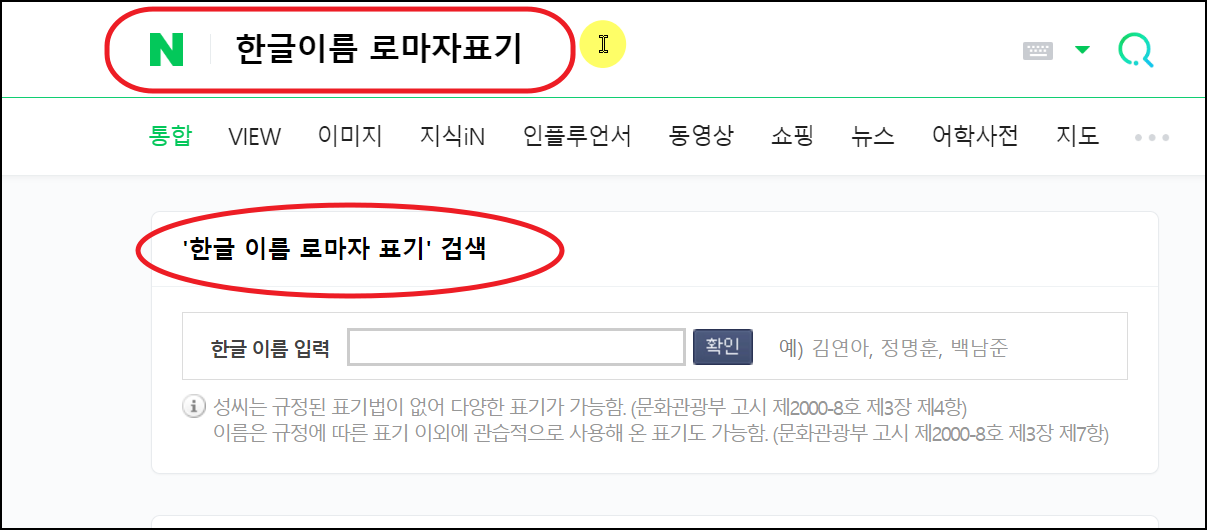 이번 시간에 진행할 영문변환 방법은 간단한 프로그램을 사용할 거에요. 무료로 사용할 수 있고, 네이버에서 검색하면 바로 찾을 수 있어요. 네이버에서 "한글이름 로마자표기"를 검색해 보세요. 그럼 바로 이용할 수 있는 프로그램이 나타나요.