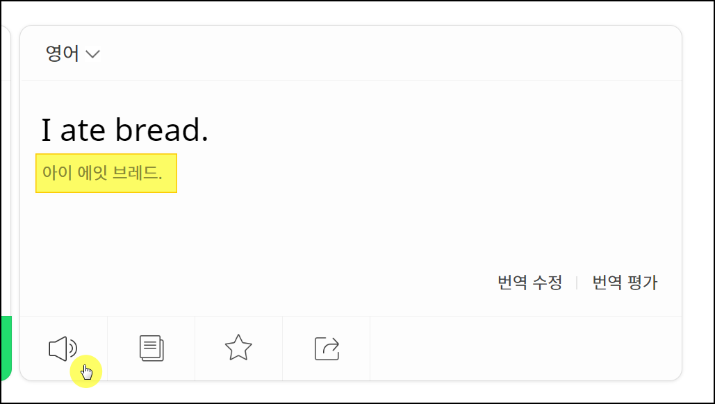 바로 옆에 있는 영역에 결고가 나왔어요. 네이버 영작기 프로그램의 경우 친절하게 어떻게 발음을 하면 되는지 한글로도 표시해 주고 있네요. 영어 문장을 중심으로 바로 아래에 보면 스피커 모양의 버튼이 있는데요. 해당 버튼을 클릭하면 발음을 소리로 들어보는 것도 가능해요. 영어 공부를 할 때에 유용하겠네요.