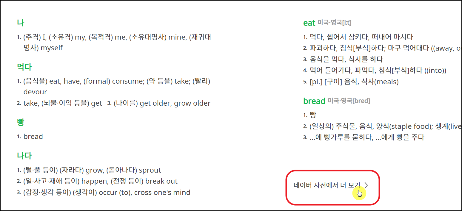 프로그램 입출력 화면 아래를 보면 다음과 같이 우리가 입력한 문장에 관련된 단어가 나타나요. 한글 또는 영어 단어인데요. 뜻도 표시가 되어 있어서 학습용으로 사용하기에 좋아요. 단어를 클릭하면 네이버 사전 사이트가 열리는데요. 그곳에서 좀 더 깊이 있는 단어 학습을 할 수 있습니다.